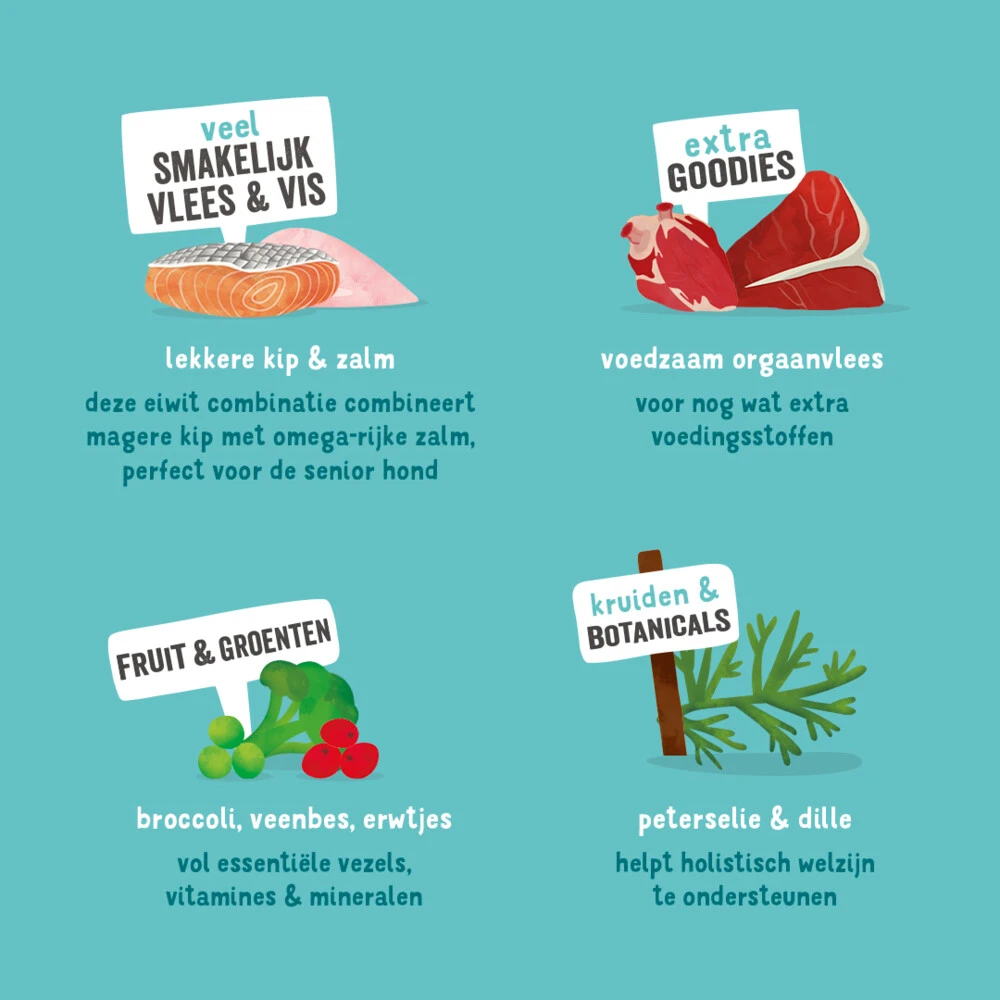 Edgard & Cooper Vers Vlees Hondenvoer Kip en Zalm met broccoli, veenbes en erwtenLekkere vleesmaaltijd gemaakt van 100% natuurlijke ingrediënten. Vlees is een van de belangrijkste ingrediënten voor de voeding van je hond. Vers vlees zit namelijk boordevol proteïnes of eiwitten. En die zijn superbelangrijk voor een gezond leven. Kip is lager in calorieën voor minder energieke honden en zalm zit vol omega 3 ter ondersteuning van de hersenen. Daarnaast zit het voer vol met b