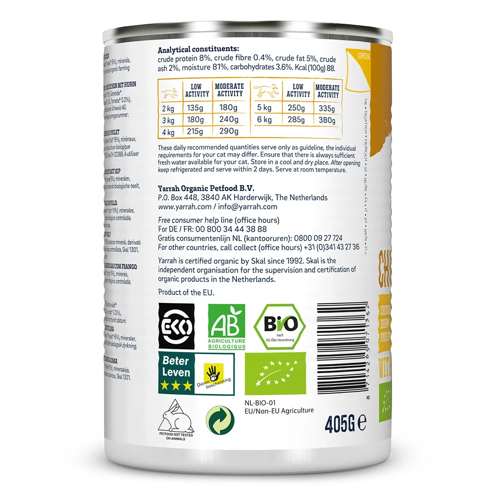 Yarrah Bio Kattenvoer Chunks KipYarrah Biologisch Kattenvoer Chunks Kip zijn smakelijke chunks met biologische kip, aangevuld met biologisch gecertificeerde brandnetel en tomaat. Geschikt voor alle kattensoorten en leeftijden, van kittens tot senior katten. Het biologische natvoer vormt een complete, voedzame en zeer smakelijke maaltijd voor je kat. Dit 405 grams blik bevat 31% biologische kip. De biologische kippen verwerkt in het voer hebben een beter leven gehad, waarbij ze buiten hebben moge