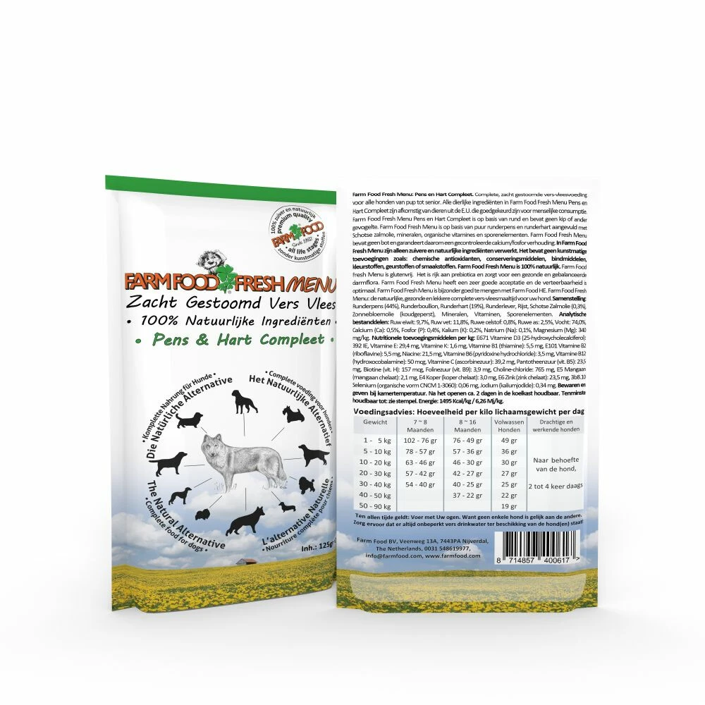 Farmfood Fresh Menu Pens En Hart CompleetFarmfood Fresh Menu is een natuurlijke, gezonde en smakelijke complete maaltijd voor jouw hond. Het is de perfecte voeding welke buiten de koelkast houdbaar is. Een ideaal alternatief voor verse diepvries voeding voor honden. Het Farmfood Fresh Menu is zachtgestoomd vers vlees, geschikt voor alle honden van alle leeftijden. De dierlijke ingrediënten komen van dieren die voor menselijke consumptie zijn goedgekeurd. De complete voeding bevat geen kip o