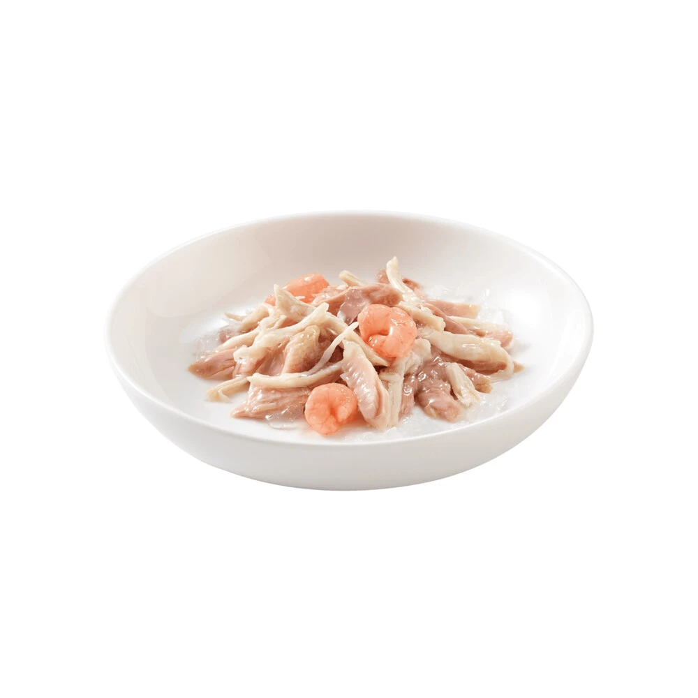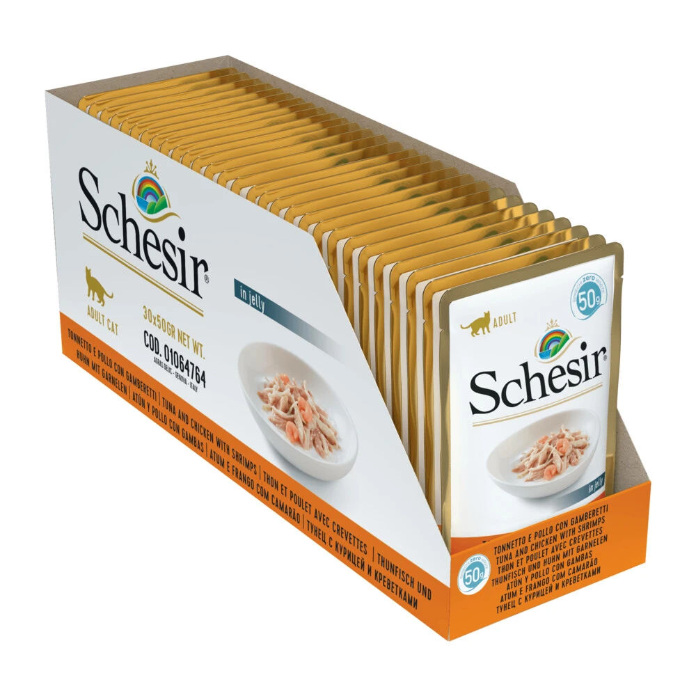 Schesir Kattenvoer Tonijn – Kip – Garnaal in GeleiHet recept is op basis van echte, heerlijke tonijn- en kipfilets gecombineerd met garnalen, de kleine heerlijke schaaldiertjes waar je nooit moe van wordt, voor een originele smaakcombinatie. In gelatine bereid, om de voorkeur tegemoet te komen van katten die houden van een verfijnde, natuurlijke smaak in combinatie met een compactere consistentie in de kom.Tonijn en kip als hoofdbestanddelen gecombineerd met een smaakvolle garnaal-topping100% na