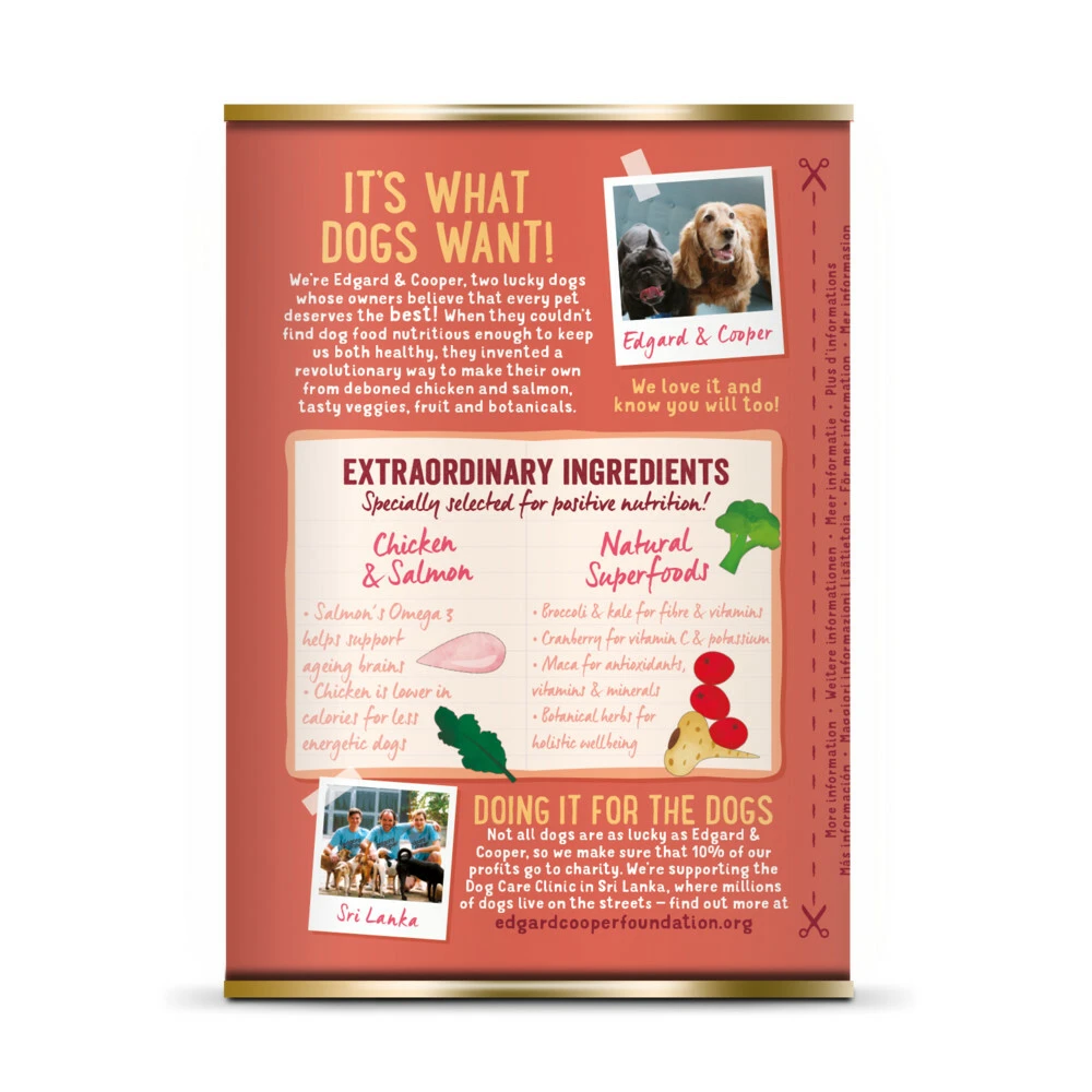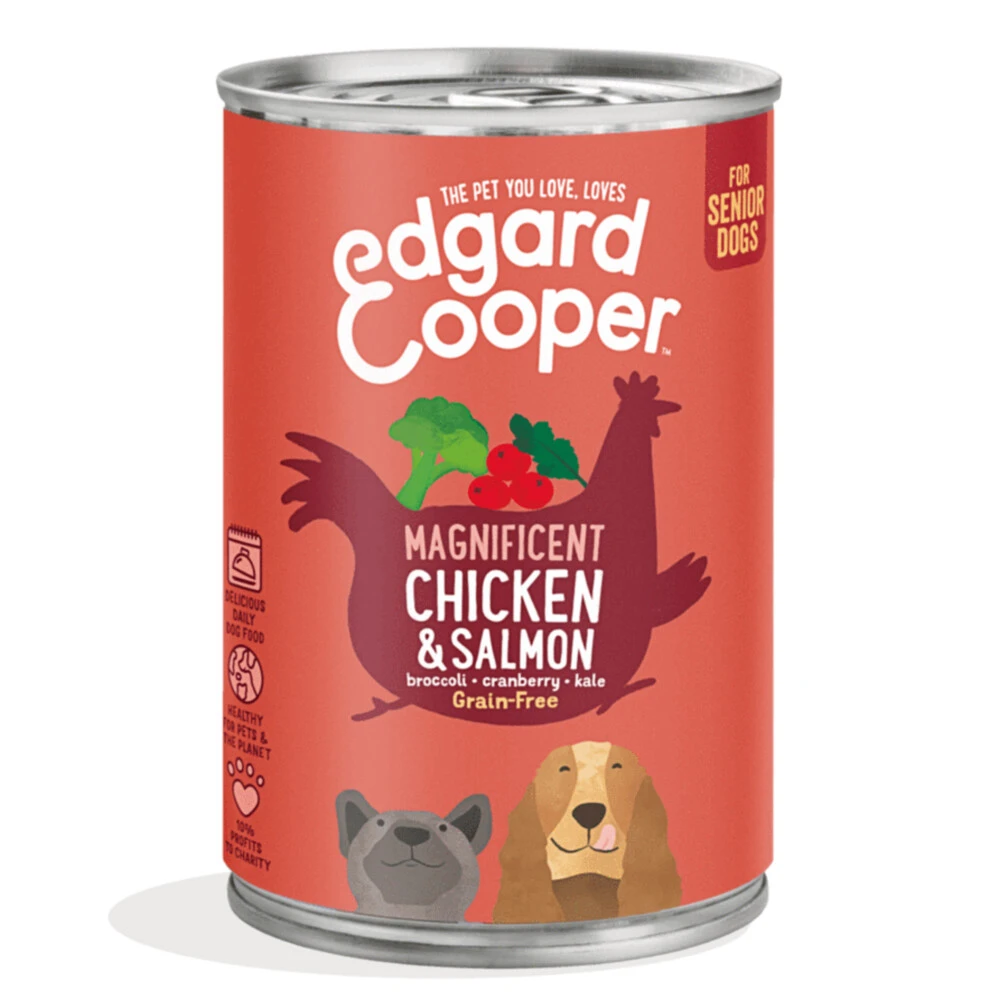 Edgard & Cooper Vers Vlees Hondenvoer Kip en Zalm met broccoli, veenbes en boerenkool.Dit graanvrije caloriearme recept combineert heerlijke kip en zalm. Een perfecte keuze voor oudere honden want het zit boordevol evenwichtige en makkelijk verteerbare eiwitten. Het is bovendien rijk aan omega 3, goed voor hersenen op leeftijd. Het recept bevat ook prebiotica voor een gezonde darmflora en extracten van glucosamine en chondroïtine voor soepele gewrichten. Als bonus verrijken we het gevog