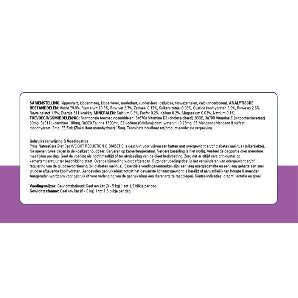 Prins Prins NatureCare Dieet Weight Reduction & Diabetic Kat NatvoerNatureCare Veterinary Diet Cat Weight Reduction & Diabetic is een natvoeding speciaal voor katten met overgewicht en/of diabetes. Deze speciale dieetvoeding is ontwikkeld in samenwerking met dierenartsen en is bedoeld om het gewicht van jouw kat stabiel en gezond te krijgen en/of te behouden. Extra voedingsvezels helpen het hongergevoel te verminderen en ondersteunen jouw kat tijdens het afvallen. Ook ondersteunt deze di