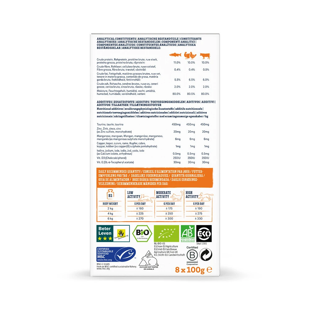 Yarrah Bio Kattenvoer Multipack Paté Graanvrij Kip – RundYarrah Bio Multipack Pate is een mixdoos met kuipjes in 3 verschillende smaken Elke smaak is een complete maaltijd in de vorm van een romige paté, zonder granen. De ingrediënten zijn biologisch gecertificeerd.Het biologische kattenvoer:Bevat aloë veraIs 100% natuurlijkIs biologischIs GraanvrijIs glutenvrijDe voordelen van Aloë Vera:Verzacht geïrriteerde slijmvliezen van maag en darmenBevordert de spijsvert