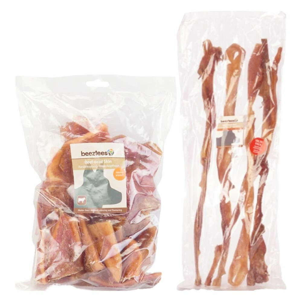 Beeztees Runderkophuid Traktatie PakketDit heerlijke Beeztees Runderkophuidtraktatie pakket bestaat uit de volgende snacks: Beeztees Runderkophuid Stukjes en Beeztees Runderkophuid HondensnacksVerwen je hond met dit Beeztees runderkophuidtraktatie pakket. Dan heb je altijd iets lekkers in huis voor de hond. 100% natuurlijkGraan en GlutenvrijGoed voor het gebit en tandvlees