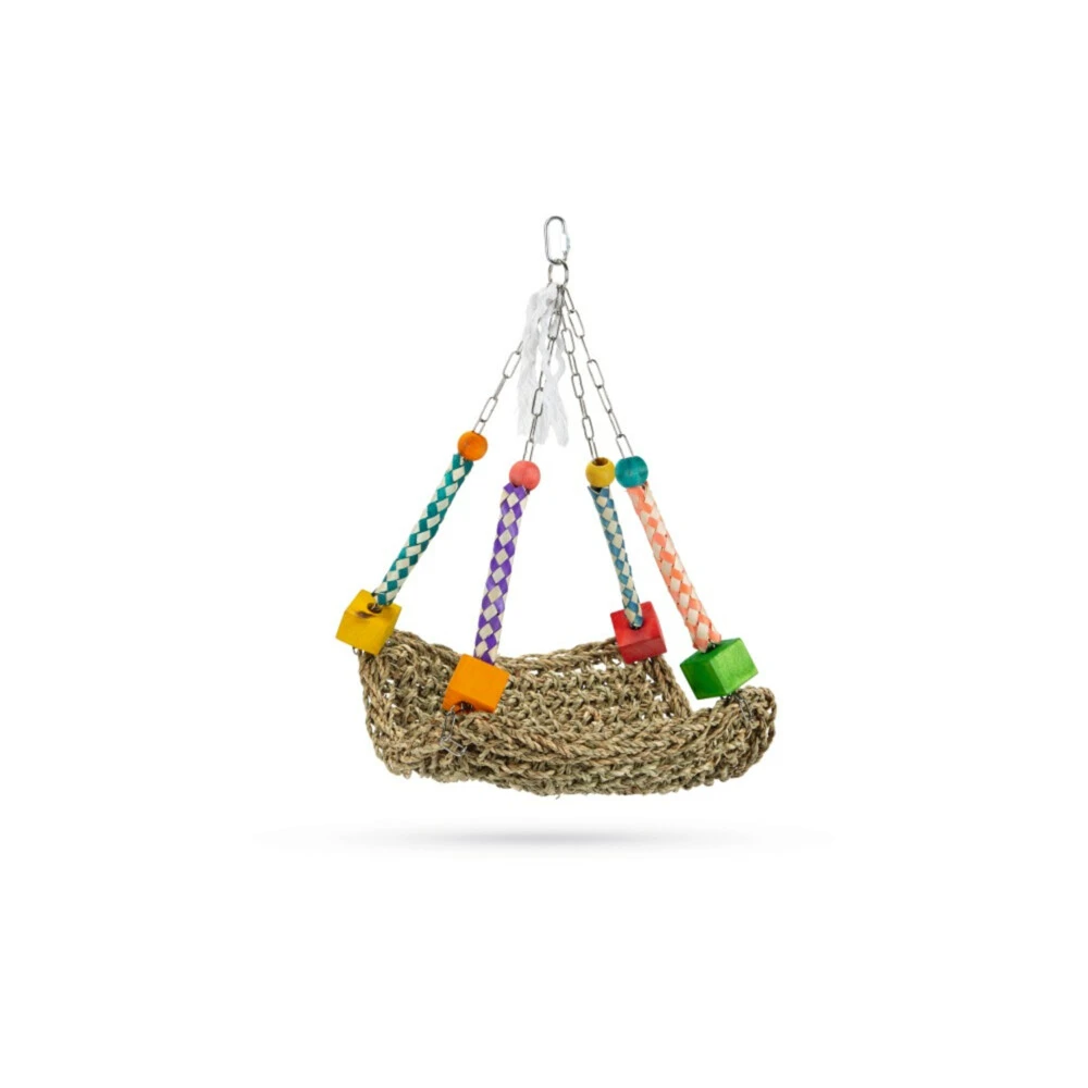 Beeztees Vogelspeelgoed NykieOp zoek naar een leuk en vrolijk hangspeeltje voor in de vogelkooi? Dan is het Beeztees Nykie vogelspeeltje iets voor jouw vogel. Dit speeltje, gemaakt van geweven gras, kun je eenvoudig ophangen door middel van het metalen haakje. Jouw vogel kan op de mat zitten en spelen met het leuke flosje en de houten blokjes en kralen.Gemaakt van geweven grasEenvoudig op te hangen door middel van een metalen haakjeGaat verveling tegen