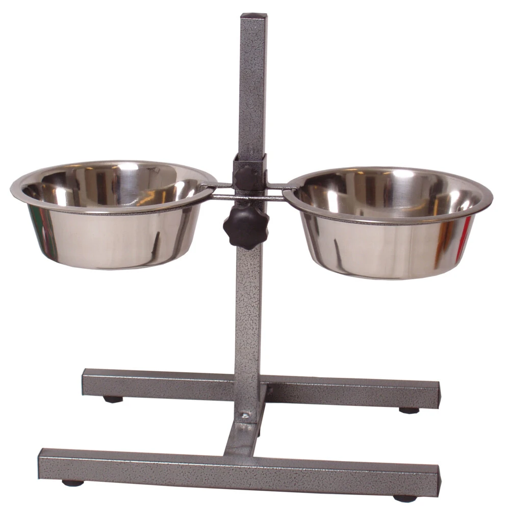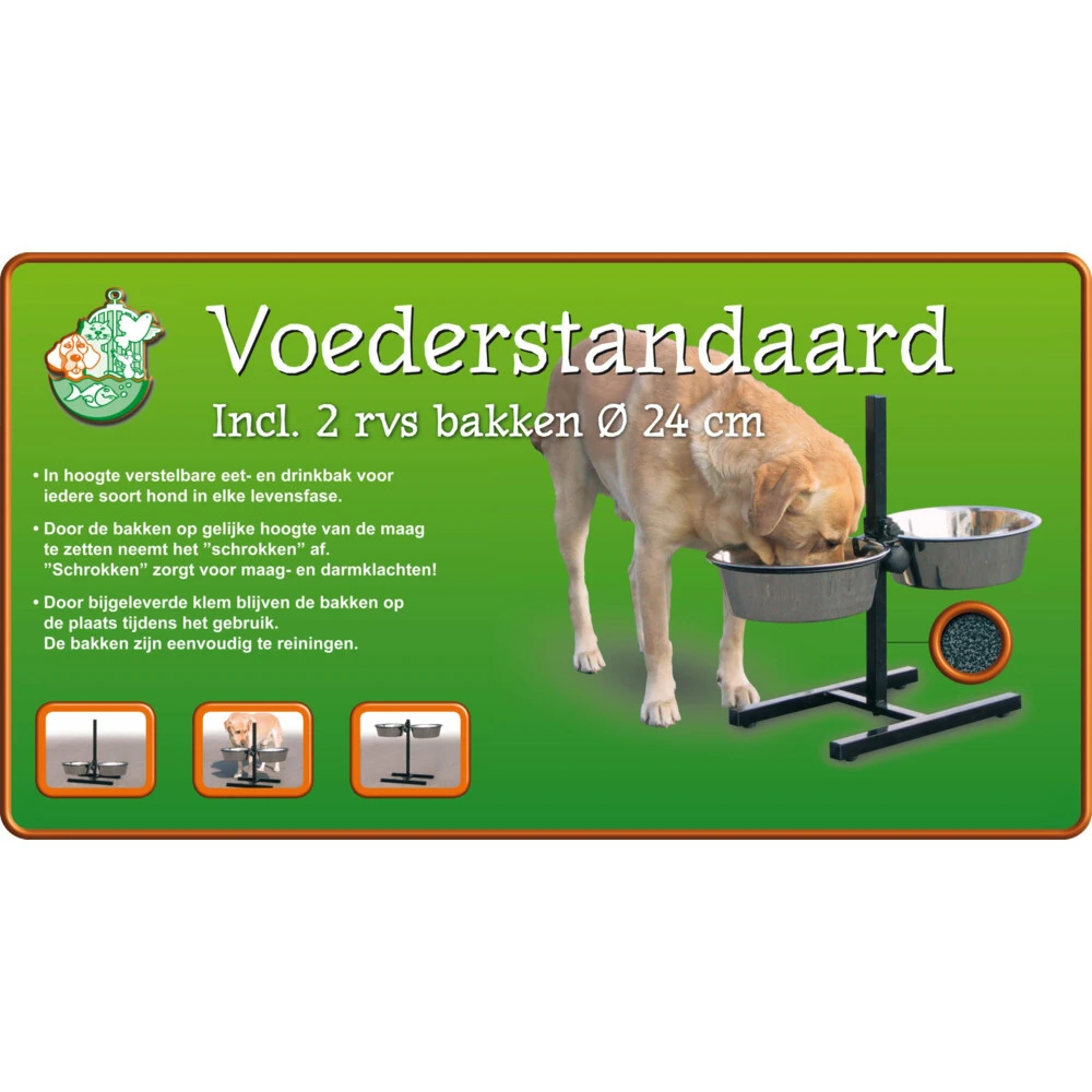 Boon H-standaard Hamerslag met Rvs BakkenDeze handige verstelbare dubbele voerbakken zorgen ervoor dat jouw hond in de meest natuurlijke stand en houding eet en drinkt. De r.v.s. voerbakken zijn op de juiste hoogte te stellen (gelijke hoogte van de maag) middels de bijpassende hamerslag standaard. Eten in de normale rechtopstaande houding van de hond bevordert de spijsvertering en laat de hond in een meer ontspannen houding zijn voeding tot zich nemen. Door de bakken op gelijke hoogte van de maa