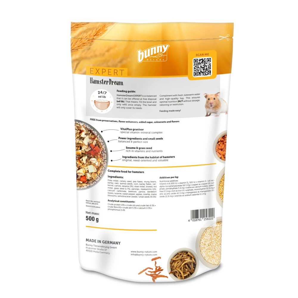 Bunny Nature Hamsterdroom ExpertVerwen je hamster met Bunny HamsterDroom Expert hamstervoer, een specialistische en volledige voeding voor hamsters. Het voer is vrij van pellets en voorziet optimaal in de voedingsbehoefte van hamsters. De voeding bevat inhoudsstoffen die zijn afgestemd op de natuurlijke omgeving van hamsters en bevat een speciale combinatie van vitaminen en sporenelementen.Ook geschikt voor diabetesgevoelige hamstersVerrijkt met quinoa en mungbonenVoorziet in de eiwitbehoefte do