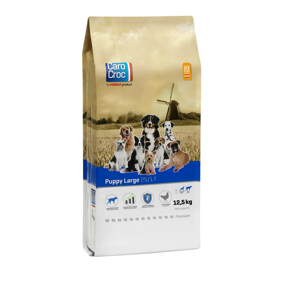 CaroCroc Puppyvoer LargeCaroCroc Puppyvoer Large is specifiek afgestemd op pups van middelgrote en- en grote rassen. De brokken zijn zo afgestemd dat jouw pup precies voldoende energie krijgt om zich volop te ontwikkelen en geleidelijke groei mogelijk te maken.Pups voor grote rassenOndersteunt ideale groeiOndersteunt weerstandRijk aan kip