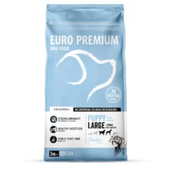 Euro-Premium Puppy Large Kip – RijstEuro-Premium Puppy Large – Kip & Rijst is een volledige, super-premium voeding voor opgroeiende honden van grote rassen (1-18 maanden en vanaf 25kg volwassen gewicht). Een optimale weerstand en een gezonde spijsvertering worden ondersteund door de toevoeging van een unieke blend van plantenextracten – rijk aan antioxidanten – aangevuld met prebiotica en β-glucanen.Een optimale verhouding Omega-3 / Omega-6 vetzuren bevordert een gezonde huid en glanzen