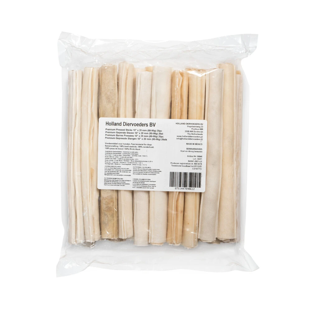 Holland Diervoeders Premium Geperste KauwstaafVerwen je hond met de geperste kauwstaven van Holland Diervoeders. Deze kauwstaven zijn gemaakt van buffelhuid, wat gemaakt wordt van runderhuid. De kauwstaven houden je hond lekker bezig en zorgen er daarnaast voor dat tandplak wordt tegengegaan.Vrij van kleurstoffen en conserveringsmiddelenHeerlijke traktatieHelpt tandplak te voorkomen