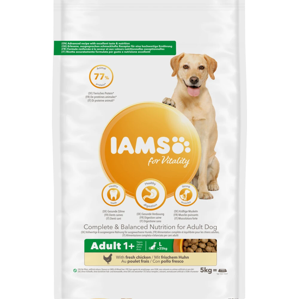 Iams Dog Adult Large Kip 5 kgIams for Vitality voor volwassen honden van grote rassen is een 100% complete en uitgebalanceerde specialistische voeding die de gezondheid en vitaliteit van jouw hond op 7 punten ondersteunt, waaronder zijn groei en ontwikkeling. Dit alles zit in een heerlijk recept met 77% dierlijke eiwitten (van het totale eiwitgehalte), waar jouw huisdier elke dag weer van kan genieten.Voor honden van grote en zeer grote rassen van 1 tot 8 jaar77% dierlijke eiwitten