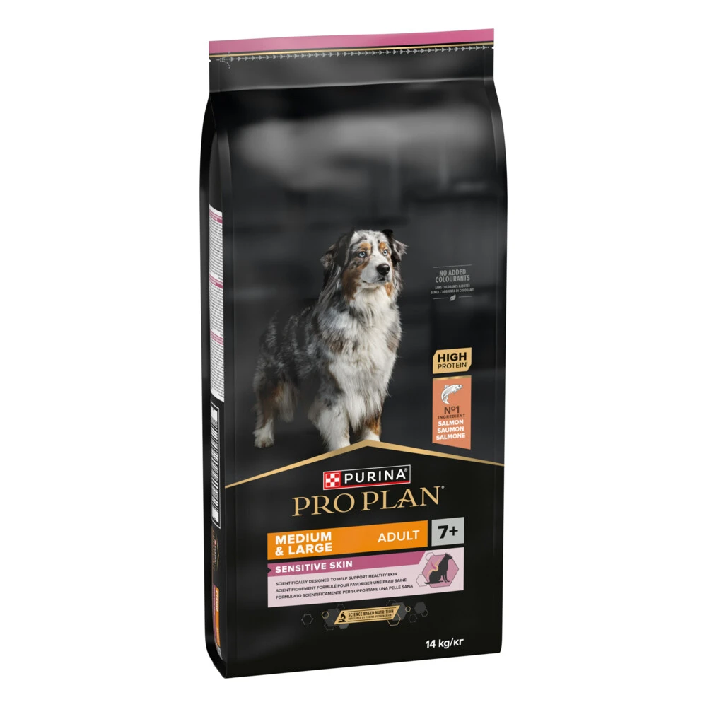 Pro Plan Adult 7+ Medium & Large Sensitive Skin ZalmComplete voeding voor honden vanaf 7 jaar van medium of grote rassen met een gevoelige huid (voorheen OptiDerma).Deze voeding bevat een speciale combinatie van voedingstoffen gericht op de huid, zoals eiwitbronnen uit aminozuren, essentiële vetzuren, B vitaminen en zink, die aantoonbaar een gezonde huid en glanzende vacht ondersteunen.Deze complete, droge voeding is rijk aan zalm, met zorgvuldig geselecteerde ingrediënten voor gez