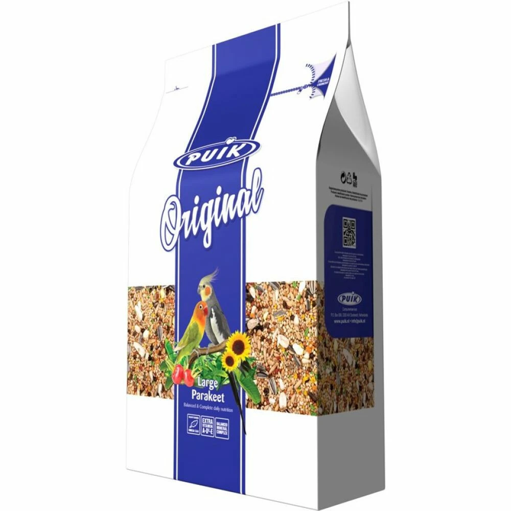 Puik Original Voer Voor Grote ParkietenPuik Original Grote Parkiet is een uitgebalanceerde dagelijkse voeding voor veel soorten grote parkieten zoals valkparkieten en agaporniden. De gevarieerde mengeling met maar liefst 17 ingrediënten maakt dit product voor veel soorten een geschikte voeding. De omega 3- en 6-vetzuren ondersteunen de algehele gezondheid en dragen bij aan een gezond en glanzend verenpak. Bevat snoepkorrels met alle noodzakelijke vitaminen en mineralen. Het sinaasappelaroma bev
