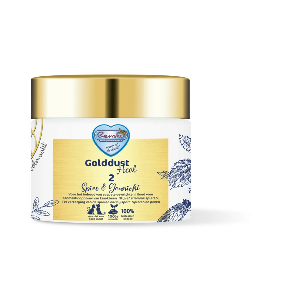 Renske Golddust Heal 3 Spier & GewrichtGolddust Heal is een 100% natuurlijke lijn voedingssupplementen speciaal voor honden en katten. De Supplementen zijn allen ‘Bio-Energetisch Volmaakt’ wat betekent dat de ingrediënten zijn afgestemd op het energetische veld van jouw dier waardoor het product beter zijn werk kan doen.Golddust Heal bestaat een groot gedeelte uit biologisch lijnzaad of lijnzaad met gecertificeerde visolie. Het lijnzaad komt uit de kop van Canada waar