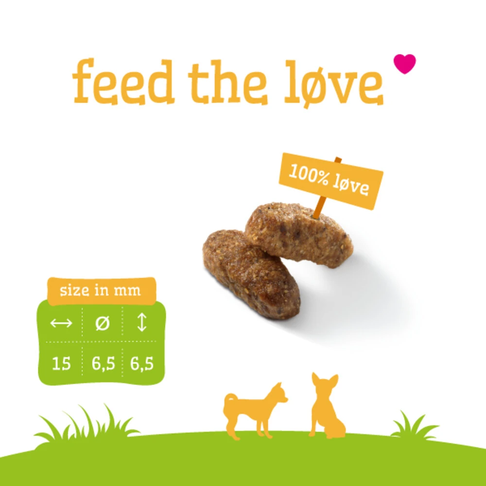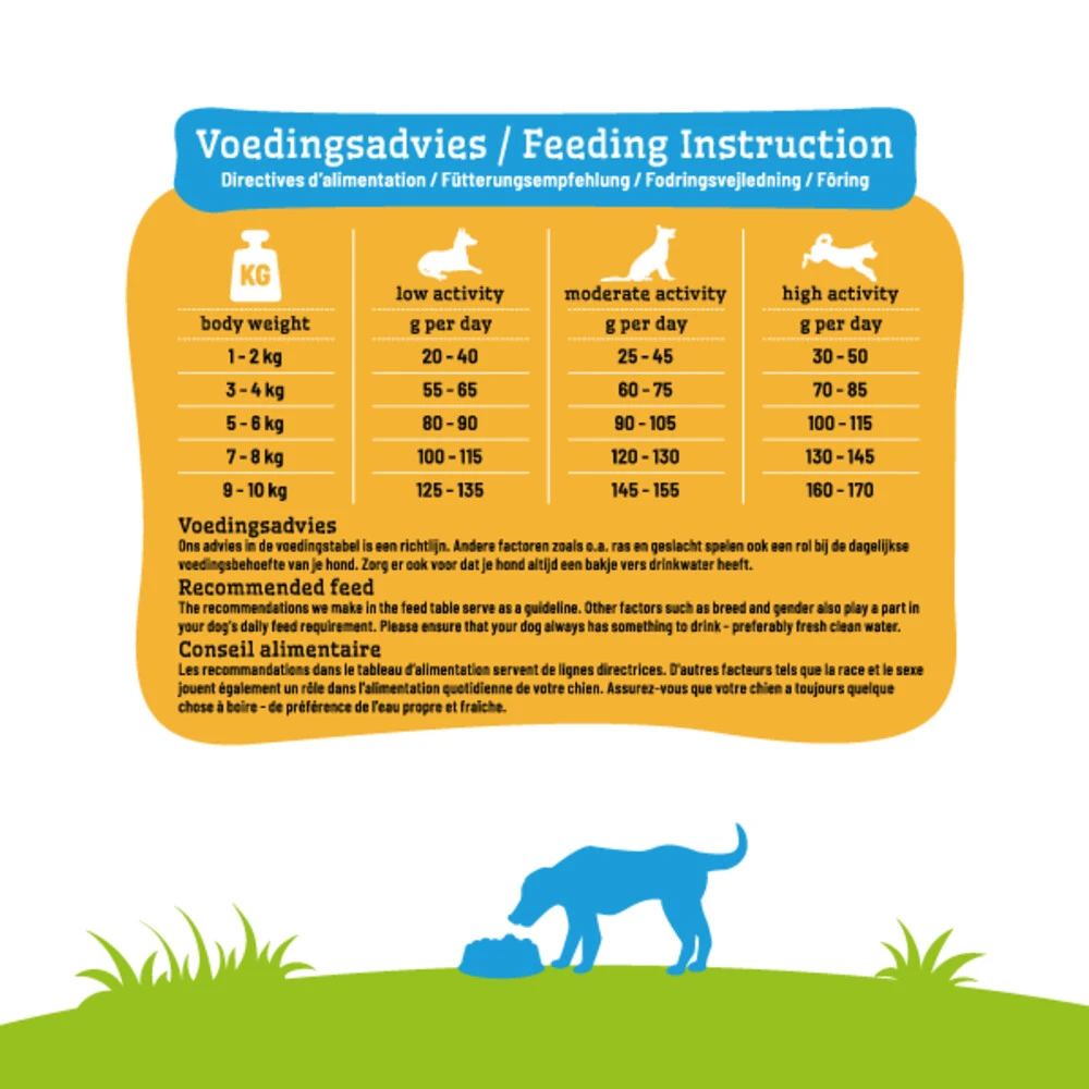 Smolke Hondenvoer Adult MiniSmølke Adult Mini is een complete Alles-in-één hondenvoeding afgestemd op de behoefte van kleine volwassen honden vanaf tien maanden met een maximaal gewicht van 10kg. Het recept van deze lekkere en gezonde hondenbrokjes heeft als basis drie verschillende dierlijke eiwitbronnen, namelijk (verse) kip, duurzaam gevangen vis en lam. De voeding is samengesteld zonder tarwegluten en er zitten geen kunstmatige geur-, kleur- en smaakstoffen in. Smø