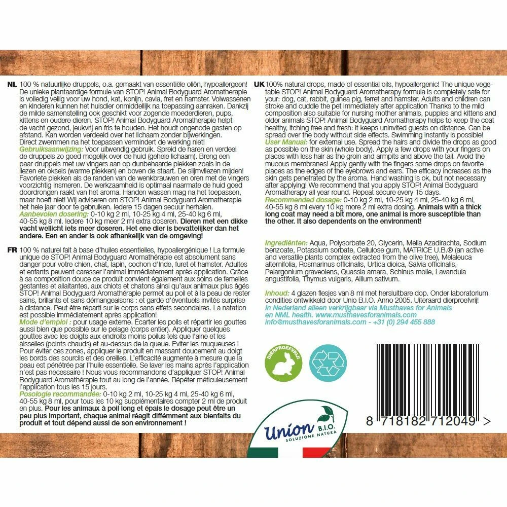 STOP! Animal Bodyguard Aromatherapie Anti Vlooien en Teken Druppels Hond en KatHet groene alternatief tegen vlooien en teken bij huisdieren. 100% natuurlijke druppels, o.a. gemaakt van essentiële oliën, hypoallergeen! De unieke plantaardige formule van STOP! Animal Bodyguard Aromatherapie is volledig veilig voor je hond, kat, konijn, cavia, fret en hamster. Volwassenen en kinderen kunnen het huisdier onmiddellijk na toepassing aanraken.Plantaardige, hypoallergene druppelsVeilig voor di