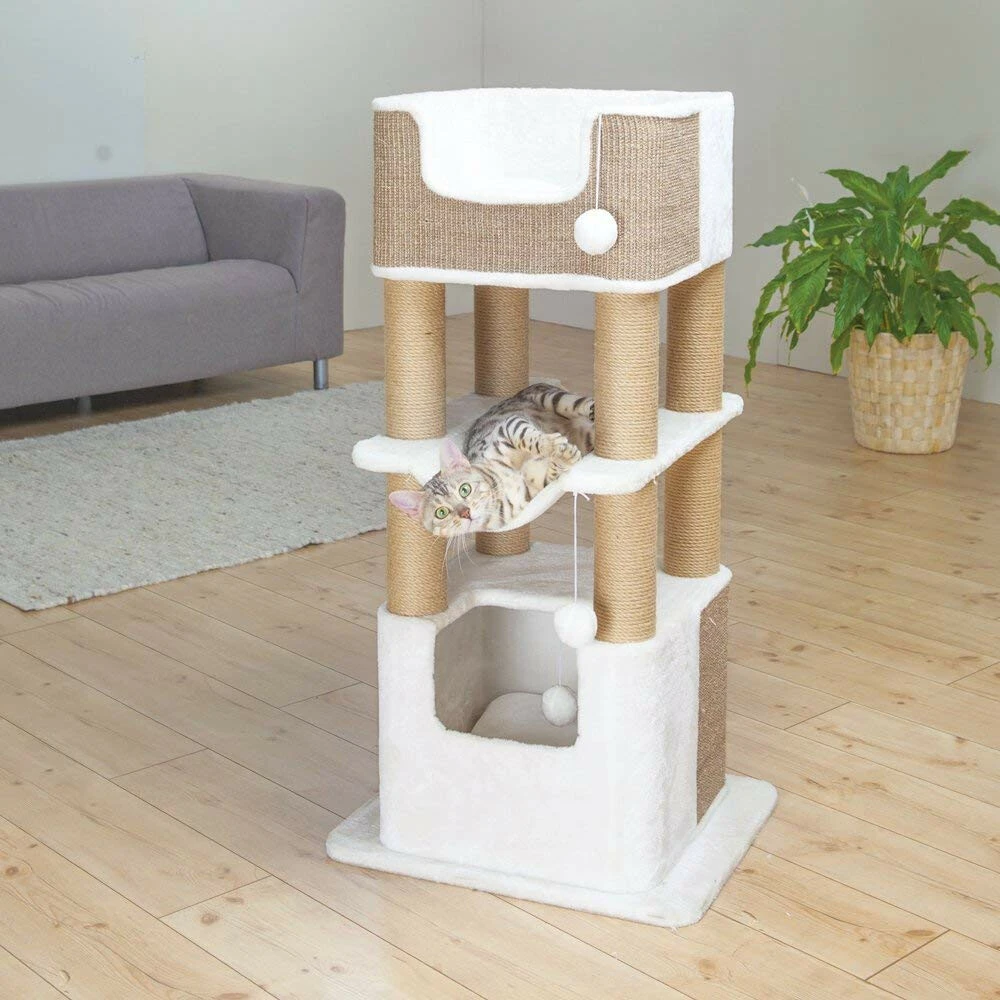 Trixie Krabpaal LucanoKrabpaal Lucano van Trixie is een mooie krabpaal met pluche bekleding en een sisal-krabvlak. De krabpaal is voorzien van verschillende stammen die bekleed zijn met jute. Daarnaast bevat de krabpaal een schuilplaats die van binnen heerlijk bekleed is met pluche. De zachte en wendbare kussens in de krabpaal zijn geschikt voor een handwas en daarnaast is de krabpaal ook nog voorzien van een leuk ligmandje en een speeltje.Bekleed met jute en plucheWasbare kussens (handwas)Met s