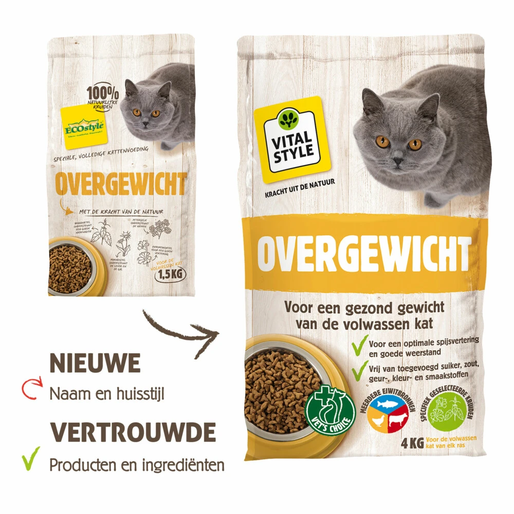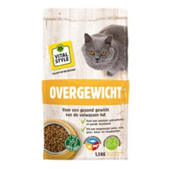 VITALstyle Kat OvergewichtVITALstyle (voorheen ECOstyle) overgewicht kattenbrokjes: een volledige dieetvoedingVITALstyle Kat Overgewicht is voor een gezond lichaamsgewicht. Het vermindert overgewicht bij je kat. Je kunt de voeding gebruiken totdat het gewenste lichaamsgewicht bereikt is.VITALstyle Kat Overgewicht is een volledige dieetvoeding die stimuleert dat je kat afvalt en zorgt tegelijk voor een verzadigd gevoel. De voeding heeft een laag vetgehalte, een hoog gehalte aan ruwe celstof en ee
